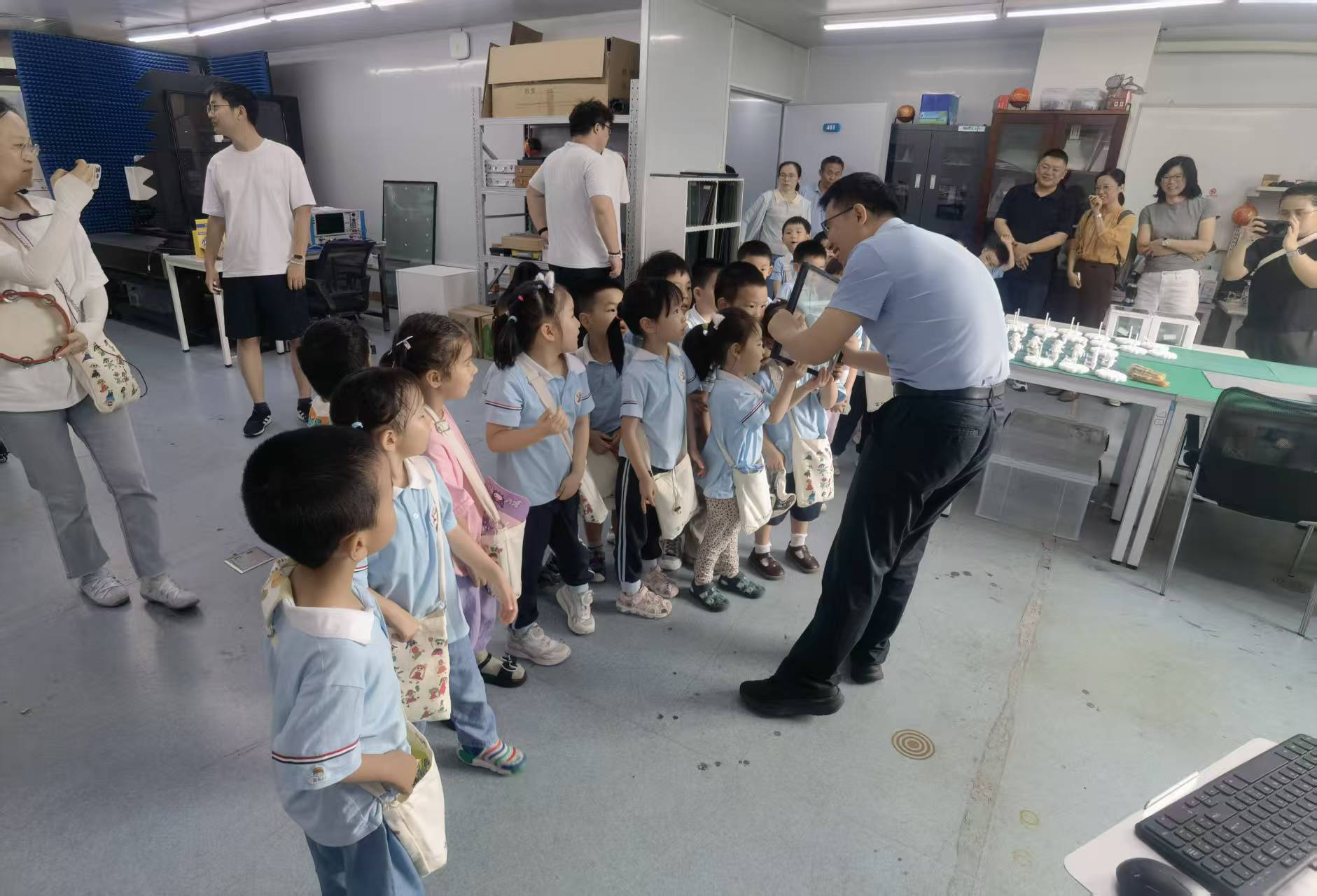 老师用浅显易懂、童趣化的语言,向小朋友们介绍实验室的功能、目前研究的东西,以及一些安全小知识,把抽象的数学原理转化为看得见、摸得着的趣味现象,让孩子们在轻松氛围中感受数学与科技的奇妙。